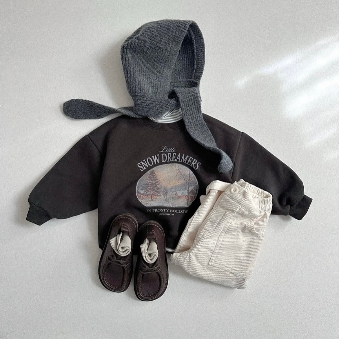 こちらのスウェットは、ロゴやデザインが入ったカジュアルなトレーナーです!柔らかい素材を使用しており、リラックスした雰囲気で着心地も抜群です。中にストライプのTシャツを重ね着しても可愛らしいデザインで、普段使いやお出かけにも最適な一着です!